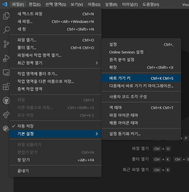 파일 -> 기본 설정 -> 바로 가기 키로 들어가게 되면