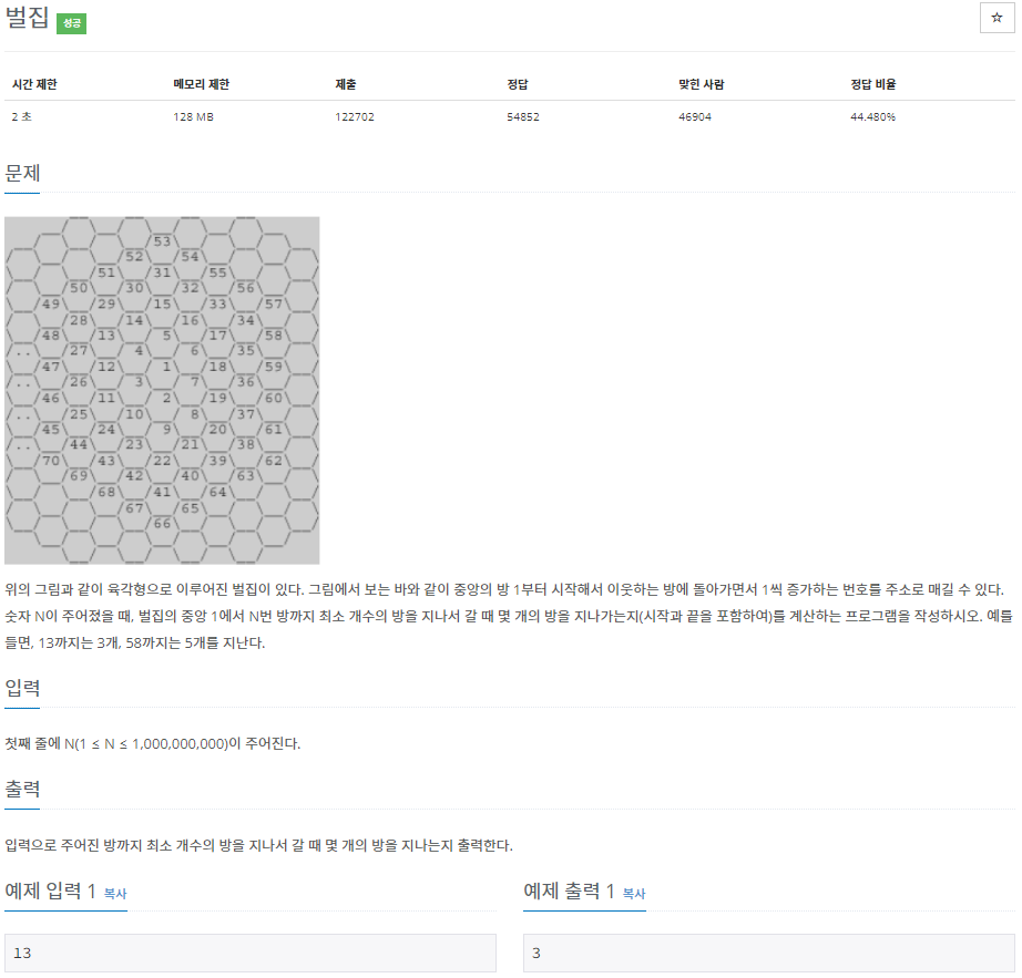 위의 그림과 같이 육각형으로 이루어진 벌집이 있다. 그림에서 보는 바와 같이 중앙의 방 1부터 시작해서 이웃하는 방에 돌아가면서 1씩 증가하는 번호를 주소로 매길 수 있다. 숫자 N이 주어졌