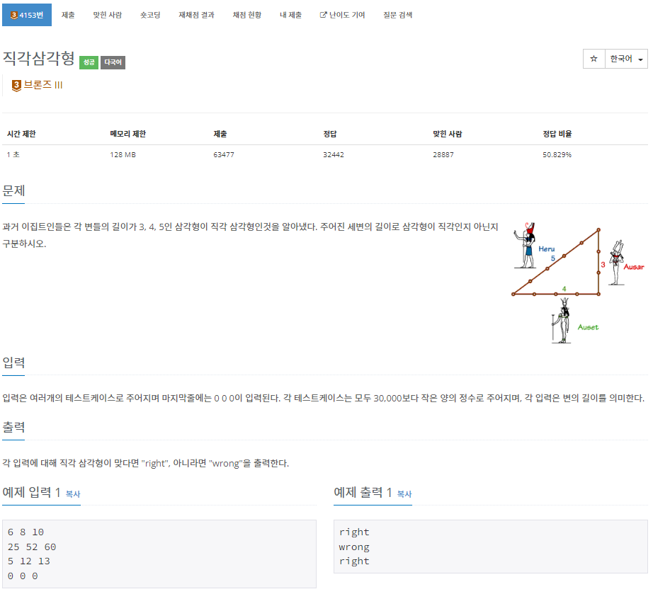 입력은 여러개의 테스트케이스로 주어지며 마지막줄에는 0 0 0이 입력된다. 각 테스트케이스는 모두 30,000보다 작은 양의 정수로 주어지며, 각 입력은 변의 길이를 의미한다.