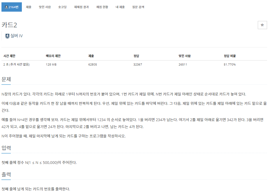 N장의 카드가 있다. 각각의 카드는 차례로 1부터 N까지의 번호가 붙어 있으며, 1번 카드가 제일 위에, N번 카드가 제일 아래인 상태로 순서대로 카드가 놓여 있다. 이제 다음과 같은 동작을 카드가