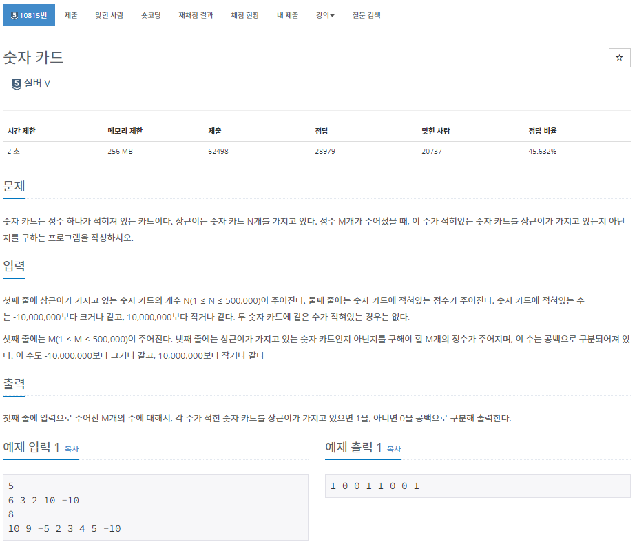 첫째 줄에 상근이가 가지고 있는 숫자 카드의 개수 N(1 ≤ N ≤ 500,000)이 주어진다. 둘째 줄에는 숫자 카드에 적혀있는 정수가 주어진다. 숫자 카드에 적혀있는 수는 -10,000,000보다 크거나 같고, 10,