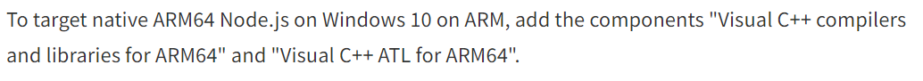 2-3) node-gyp이 Windows 10에서 ARM64를 컴파일링 하기 위해서는 Visual C++ compilers과 Visual C++ ATL for ARM64를 설치하라고 했으니 해당 기능을 체크해서 설치하면 된다.