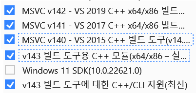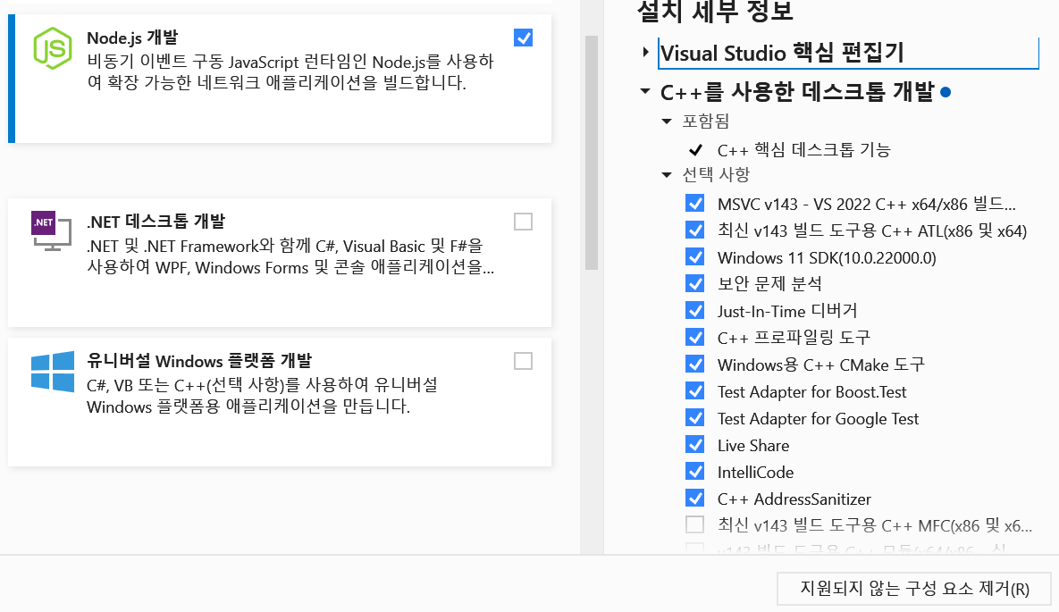 Node.js개발에서 우측의 C++를 사용한 데스크톱 개발을 사용해야 한다
