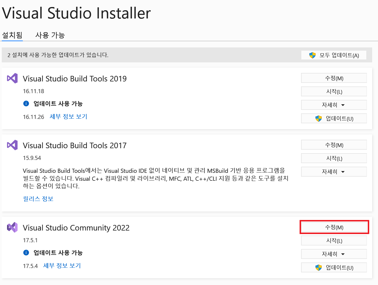 2-1) Visual Studio Installer를 켠 후 수정을 눌러준다