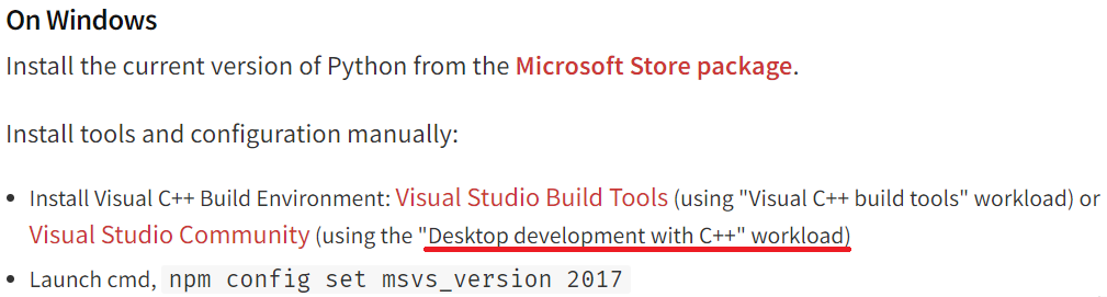 참고. node-gyp는 node.js로 쓰인 크로스플랫폼 컴파일링 라이브러리인데 당연하게도 크로스플랫폼을 지원하기 위해서는 네이티브 빌드를 위해서 MSbuild 같은 cpp빌더가 필요하다
