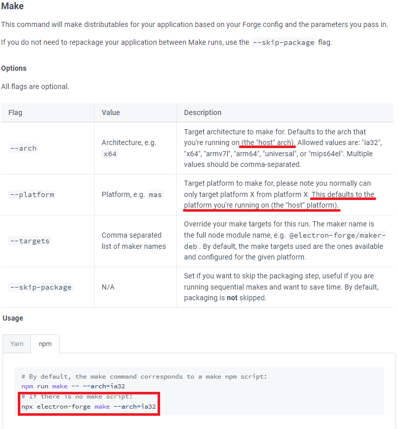Target architecture to make for. Defaults to the arch that you're running on (the "host" arch). Allowed values are: "ia32", "x64", "armv7l", "arm64", "universal", or "mips64el". Multiple values should be comma-separated.