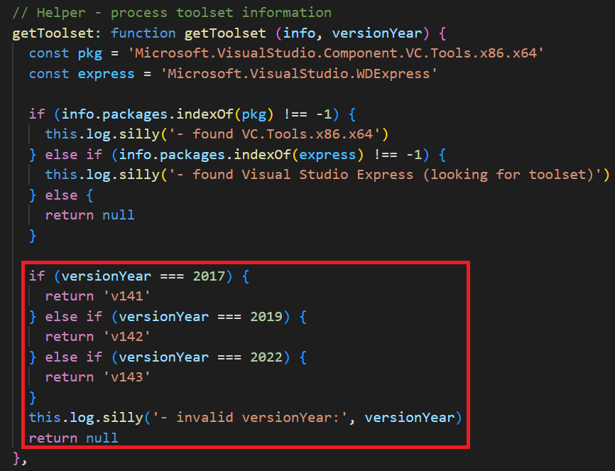 node-gyp를 보면 find-visualstudio.js가 있는데 해당 코드에서 Visual Studio와 Visual Studio Build Tools의 버전을 체킹 하는 걸 알 수 있다.