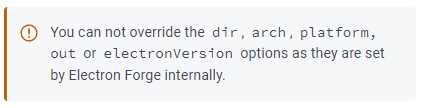 참고로 forge.config.js에서 platform, arch, dir, out, electronVersion에 관한 부분은 정의하지 않고 cli를 통해 사용한다고 한다.