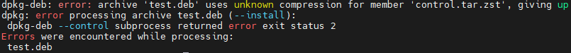 dpkg-deb: error: archive 'test.deb' uses unknown compression for member 'control.tar.zst', giving up