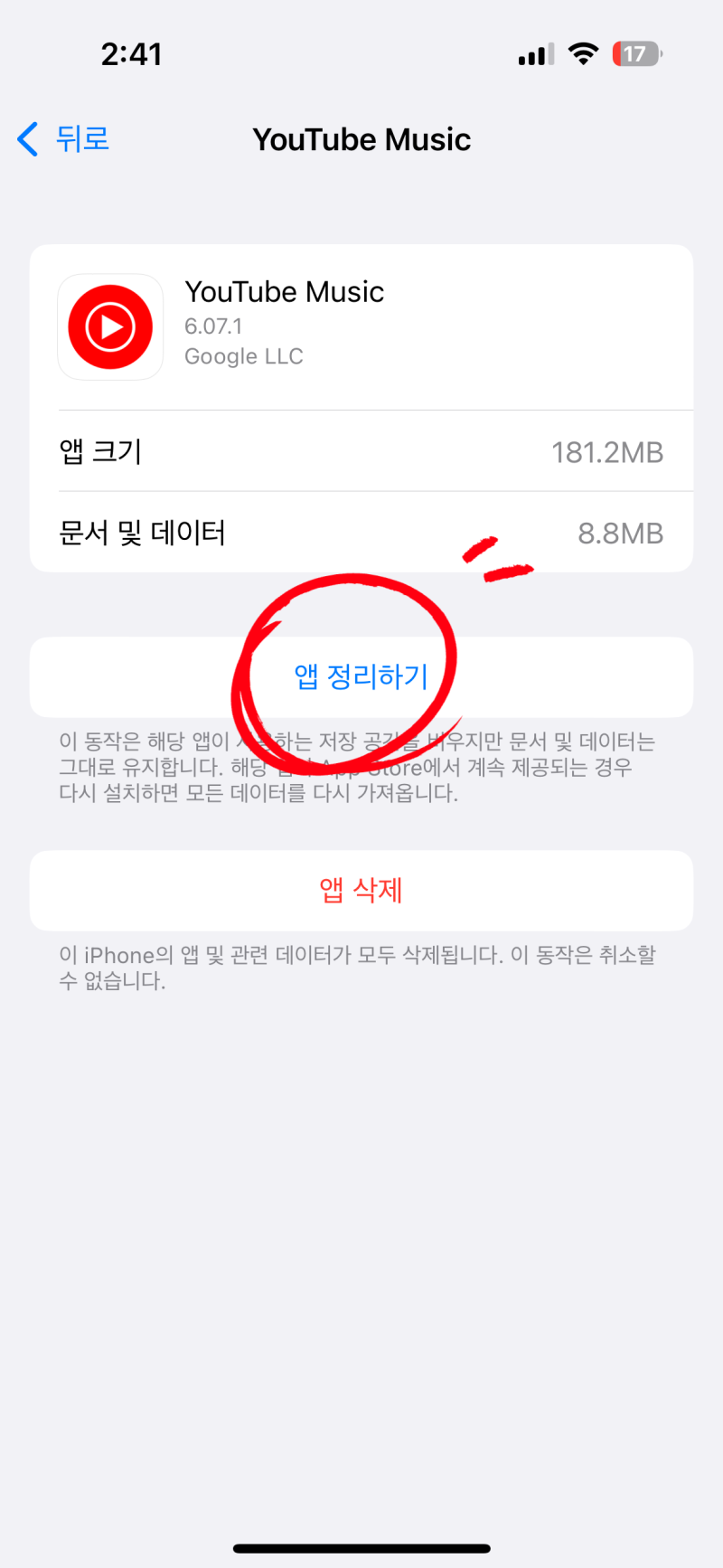 1. 아이폰의 경우 iPhone 저장 공간에서 유튜브 뮤직의 앱 정리하기를 클릭해주세요