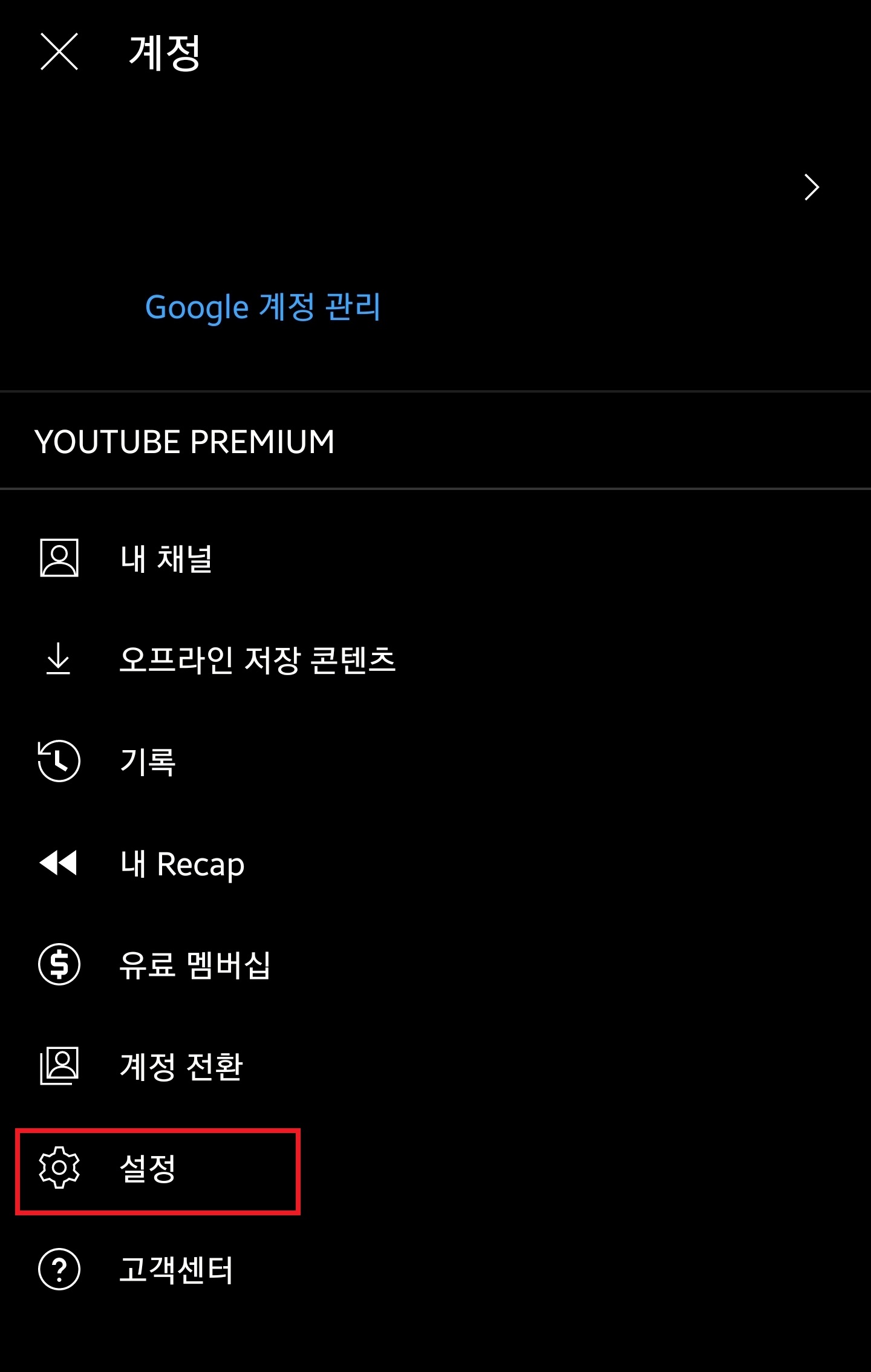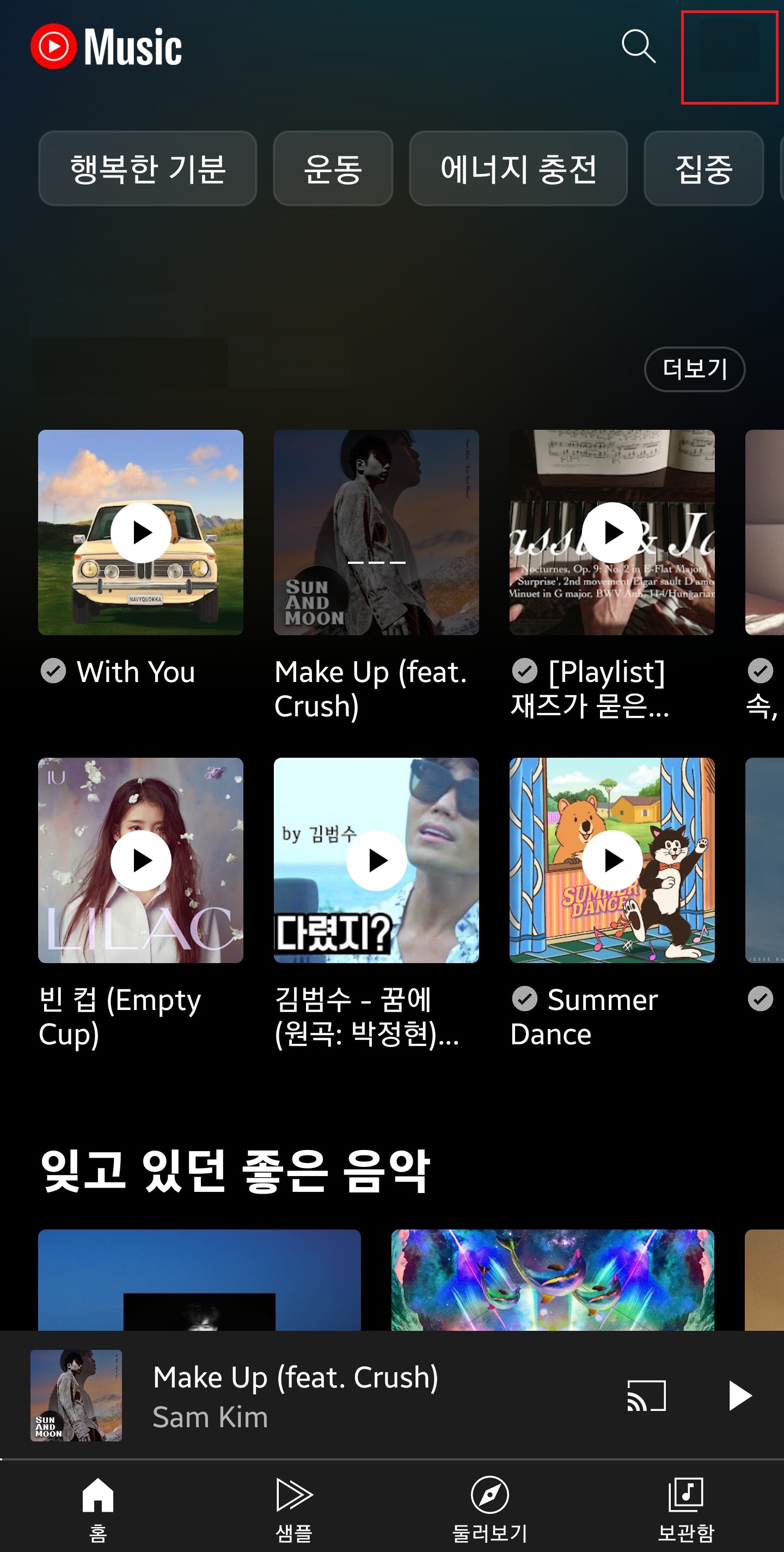 1) 유튜브 뮤직 홈에서 우측 상단의 내 계정을 누르세요.