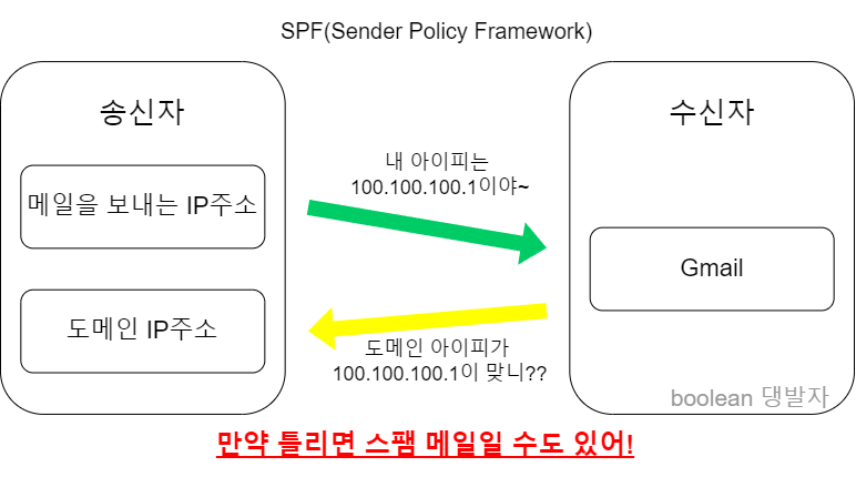 이때 메일을 보낸 서버와 도메인의 서버 IP가 다르다면 스팸 메일일 수도 있다고 판단하여 반송처리 하는 것입니다.