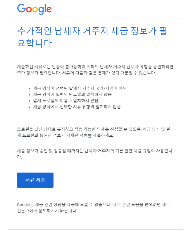 바로 구글 애드센스에서 납세자 거주지 세금 정보가 필요하다는 알람이 오는 것입니다.