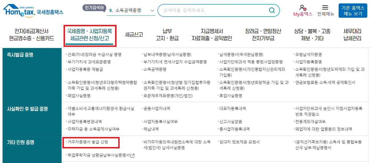 바로 홈택스에서 납세자 거주지 세금 정보를 신청하고 출력하시면 됩니다.